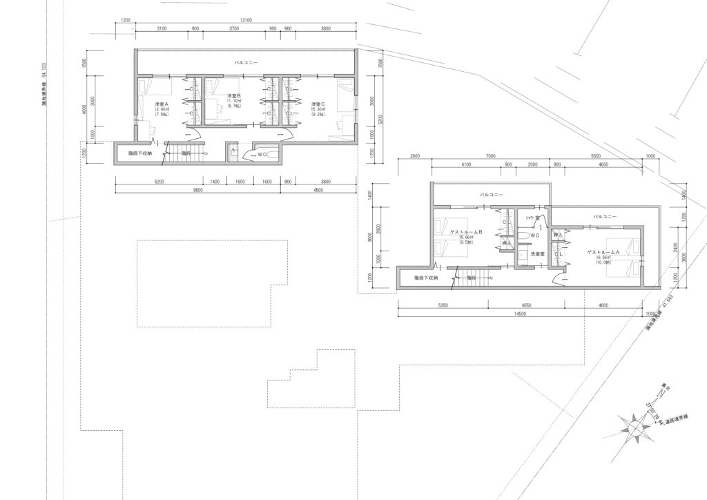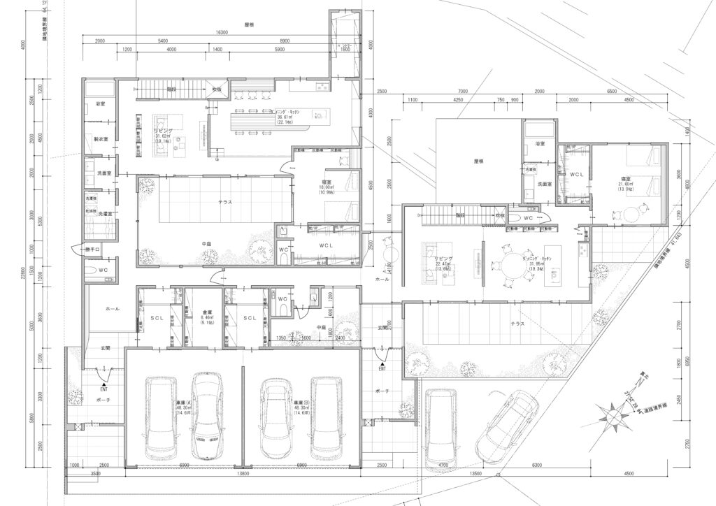 延床面積:542.16㎡(164.00坪)(A世帯:89.48坪・B世帯:74.52坪)
