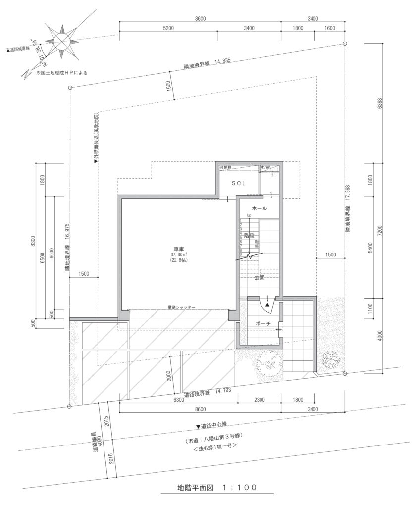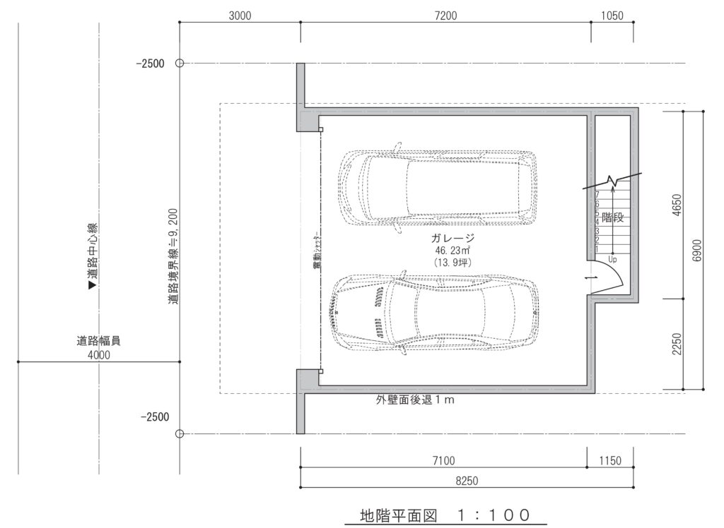 北側道路は幅員4mとややタイトですが、敷地側を約3mセットバックすることで、車両の進入・転回に配慮し、大型車でも無理なく駐車できる動線を確保しました。