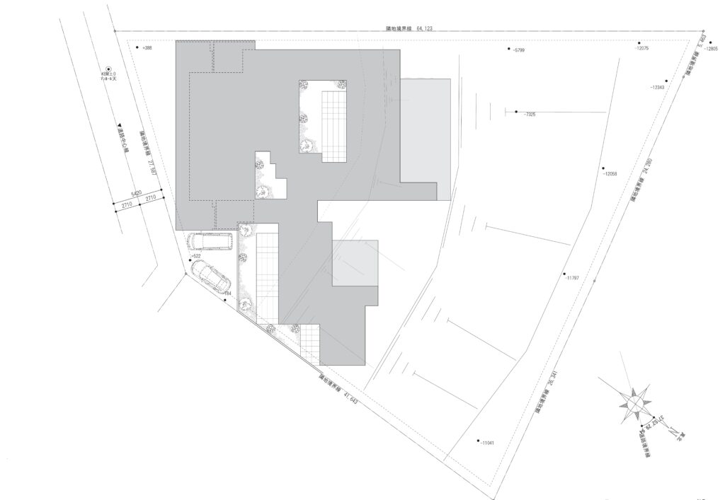 本敷地は道路側に比較的広い平場が確保されているため、全体を造成するのではなく、必要に応じて傾斜部分を部分的に利用する計画としています。敷地の広さを最大限に活かし、将来的な使い方にも柔軟に対応できる二世帯住宅を想定したプランとしました。